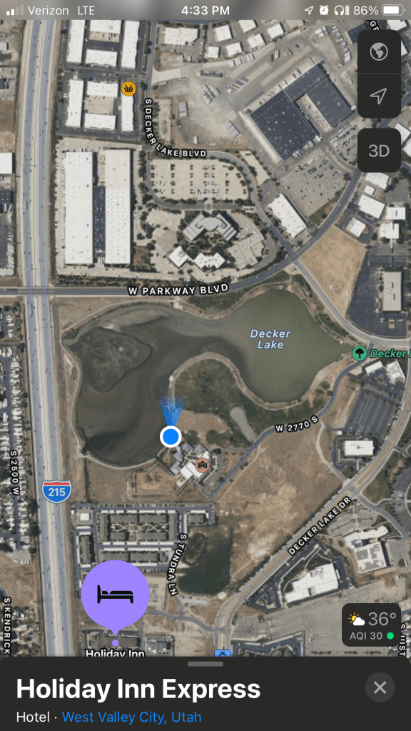 This pocket of Salt Lake City might be the Mormon Slums. The hotel was right next to I-215, tucked into a barely accessible mini-neighborhood with two sketchy apartment complexes and a facility with a very high cyclone fence, the kind that inverts in a large semi-circle at the top, which, as it turns out, is the Decker Lake Youth Center. Clearly they are more concerned with deterring anyone from the outside getting in than the other way around.