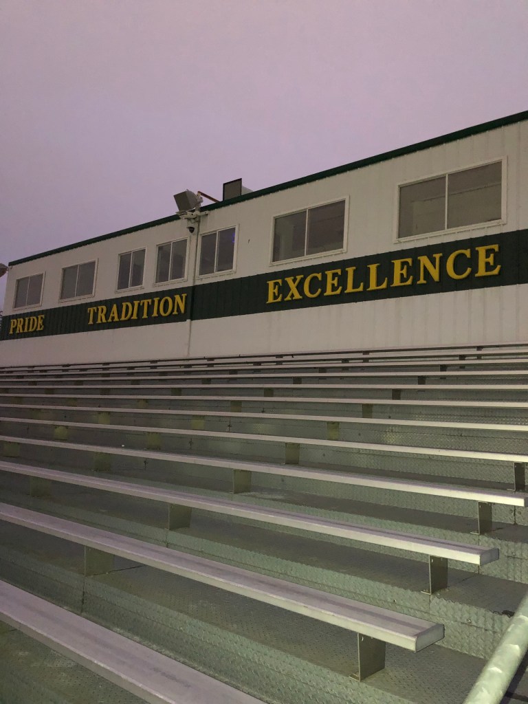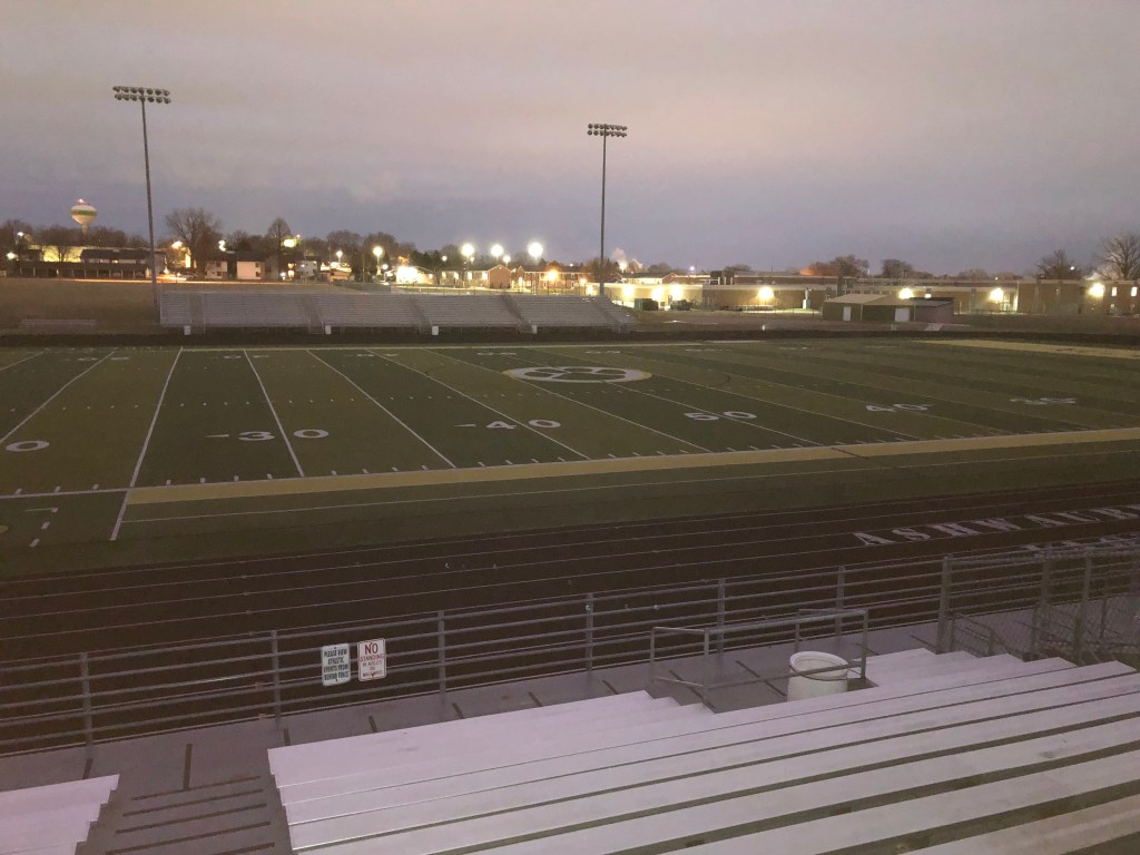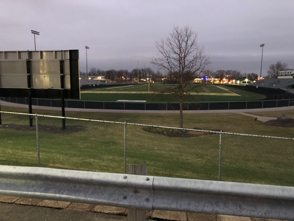 Another dusk track run, another upscale high school. This is only a few miles from historic Lambeau Field, where the Packers play. I was never a Packers fan, though I never rooted strongly against them either. I watch little football these days. The racism of the sport turned me off. I will start watching again if Kaepernick plays.