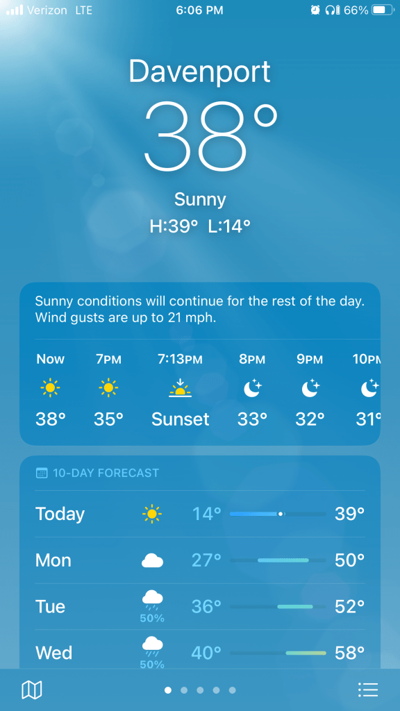 I am just looking forward to the Spring weather. I am looking forward to running in shorts. I am looking forward to driving with the sunroof open. I am looking forward to no piles of dirty snow in the hotel parking lot. I am looking forward to green fields. Road travel in the winter in the Northern U.S. is no fun. I like fun. Bring on the sun.