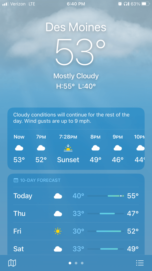 Most of my meals on this trip were home leftovers, which was a pleasant change. Barb sent me with St. Patrick’s Day corned beef, cabbage, potatoes, and carrots (enough for 2 meals); cajun pasta; Graydon’s Crossing omelette; taco meat, and chile verde. I bought some snacks for the daytime and no dinners. Breakfasts were hotel freebies (other than the omelette).