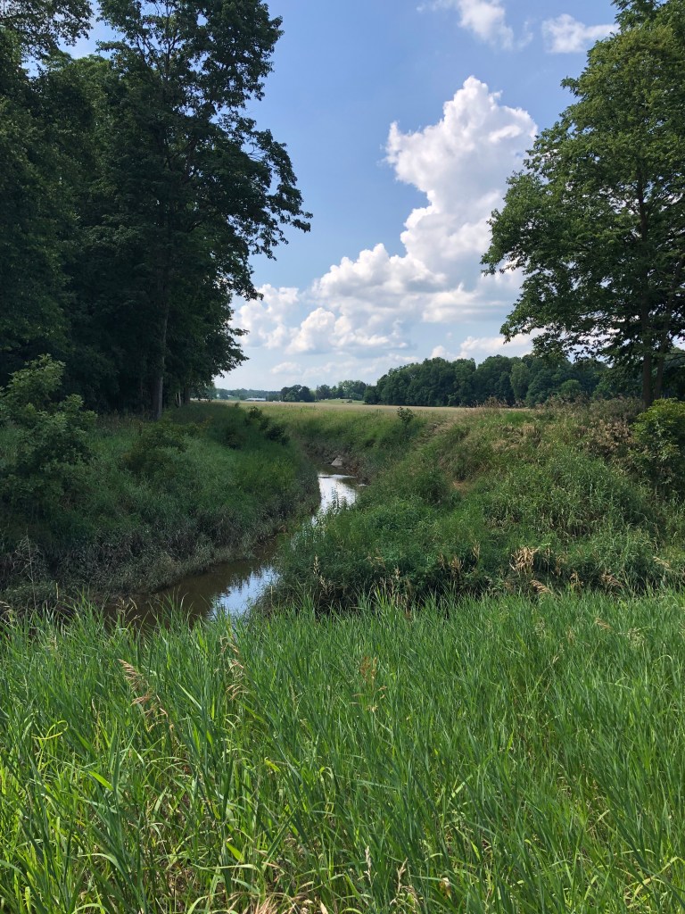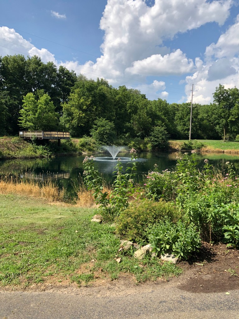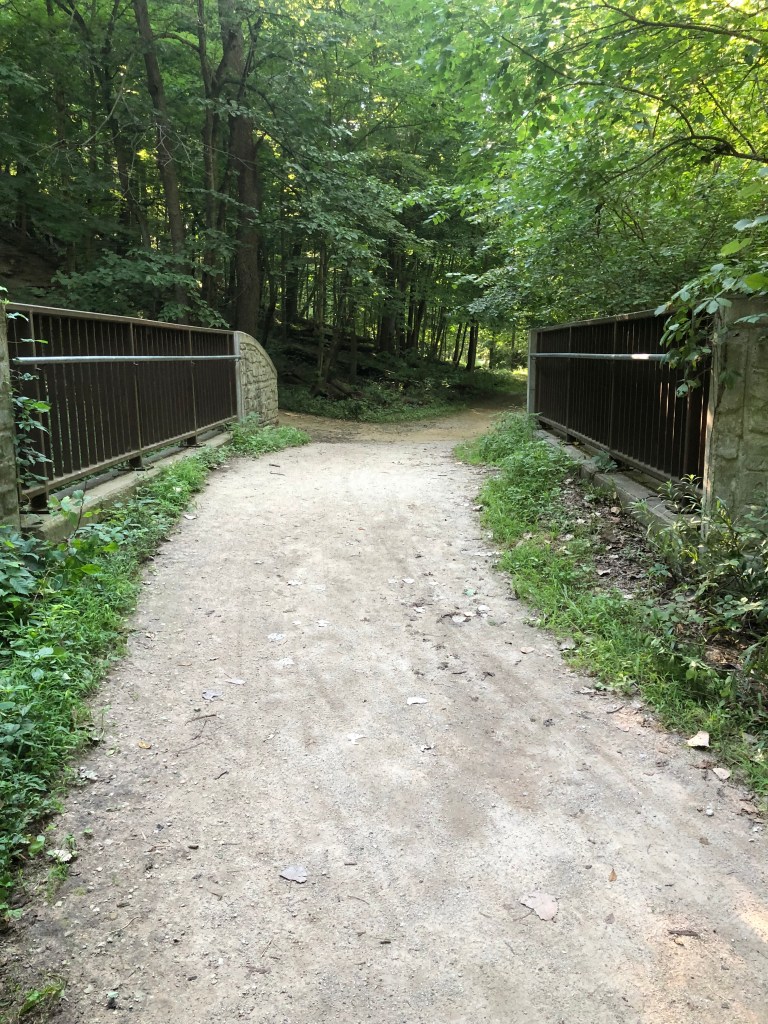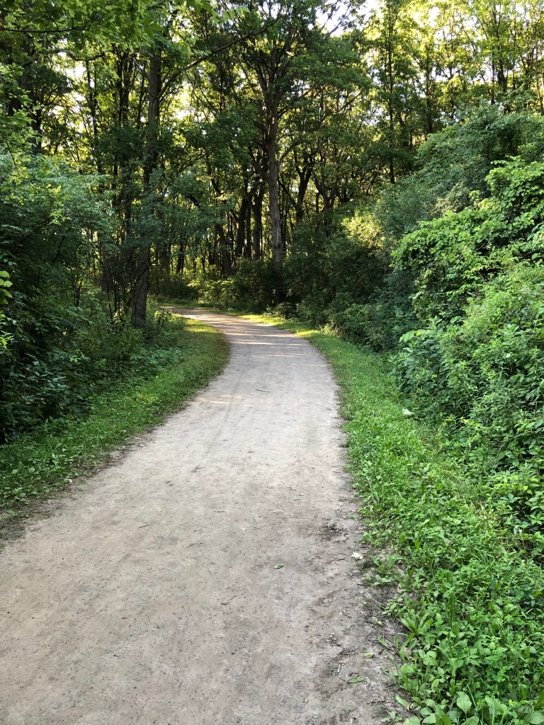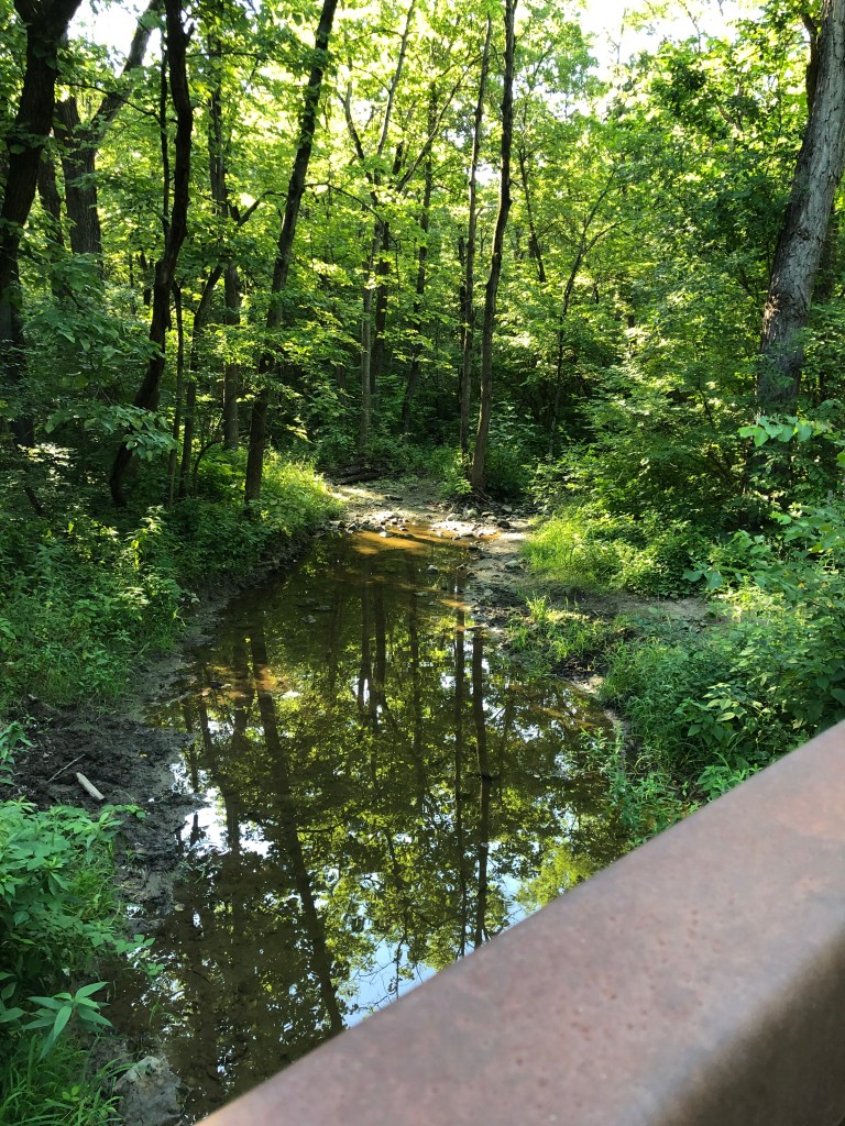 I got back to the park, jumped onto one of the mountain bike trails, and I was winding my way through the forest when I checked my fitbelt to make sure I had my hotel room card key, which I did not. Had it fallen out when I took out my phone for a photo? Had I left it on the carseat? I checked where I took a photo of a fountain in the park. Then I ran back out to my river trail and checked where I took photos of the trail and the river – no card. Where else had I taken a photo? Oh, yes, at the cornfield turnaround point. So I ran all the way out there – no card. It was lost.