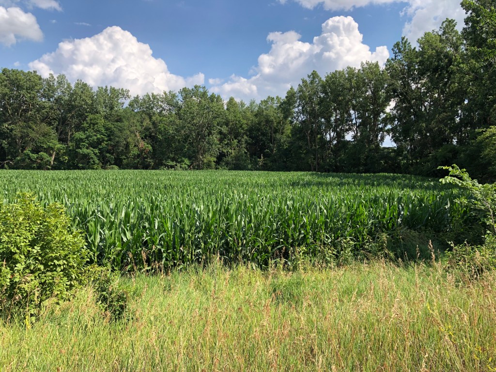 I ran as far as I could north of the interstate, and then there was a gate, with a grassy old road running along a canal, so I just kept going. It turned out to be the Blue River, not a canal, and it is suspiciously straight. I ran mile or so out, then turned around. I took a nice photo of a cornfield at the turnaround spot.