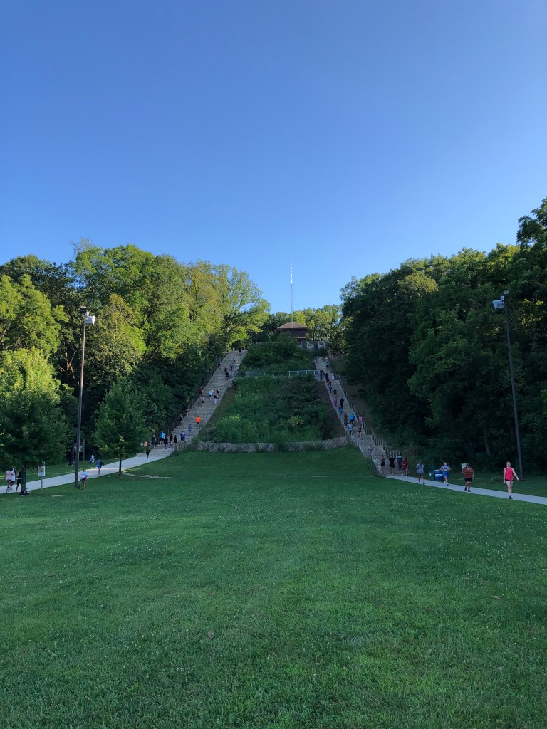 There were a bunch of people walking stairs up to a pagoda from the parking lot. It looked like some sort of ritual ceremony that involved extensive perspiration. There are not many hills in Illinois, so I suppose you have the ornament the steep ones with a pagoda, even if they are only a couple hundred feet.
