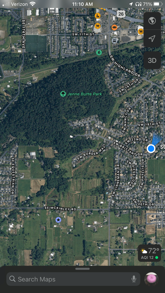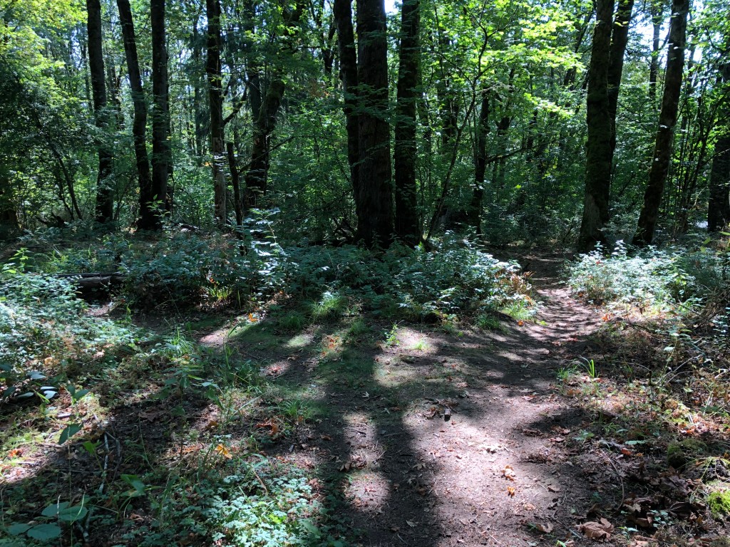 Jenne Butte is one of the several wooded cinder cones between Mt. Hood and Downtown Portland. It has no maintained trails, which means it has less foot traffic than other local buttes, like nearby Rocky Butte. The locals have their own trails, from one street to another, and they made for excellent running on a warm sunny day. I did have a brush with some stinging nettles, though, which gave me a boost.