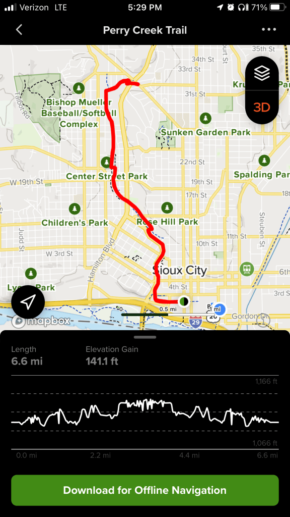 I might already have an entry for Sioux City, IA. I know I have stayed here before, in the same hotel downtown, and ate at the same hipster restaurant right next door, and I think ordered the same jambalaya both times. I did not run on the Perry Creek Trail the first time I was here – I believe it was late winter and I did not run while in town.