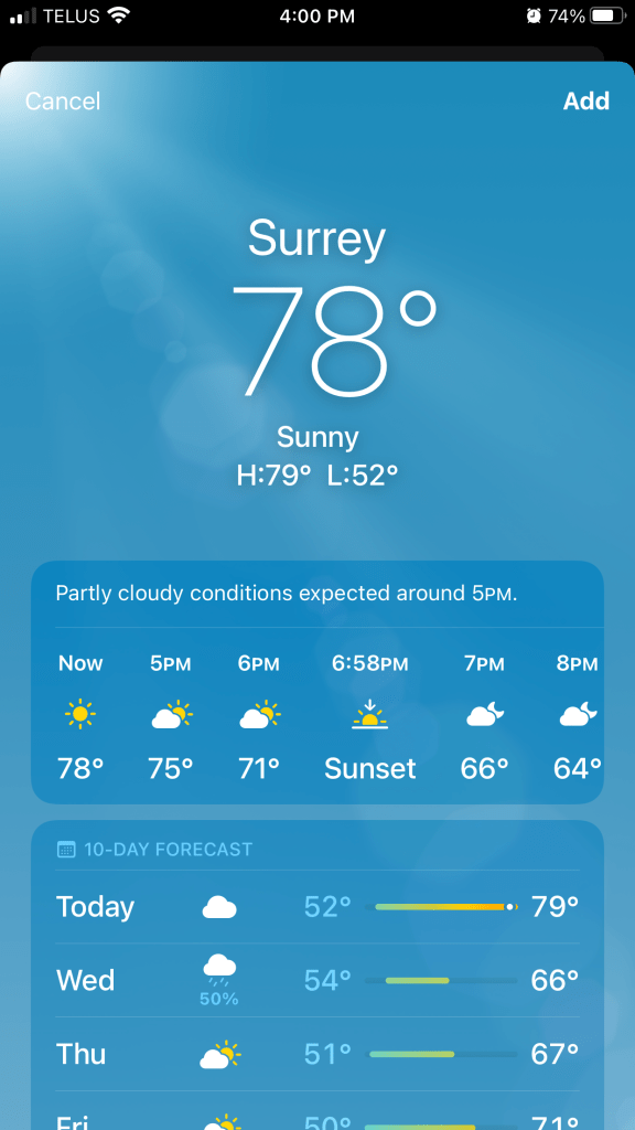 Surrey is not the garden spot of Canada. At least, I hope it isn’t. There were quite a few homeless people on the main road I took from my last sales visit of the day to the hotel. Also, parts of the town remind me of the car you haven’t washed since before winter even though it is now well into spring. This is in contrast to Regina, which I visited earlier in the month, and I genuinely didn’t recognize the same area I had stayed at when I was there in January. It was sparkly clean and picturesque.