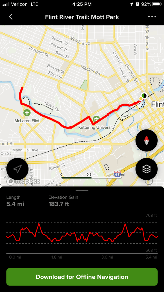 Flint River Trail: Mott Park; Run Time: 56:04 + 2-minute kick