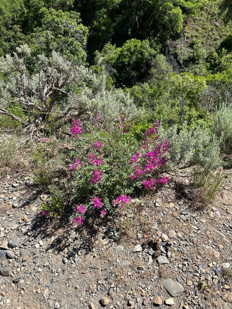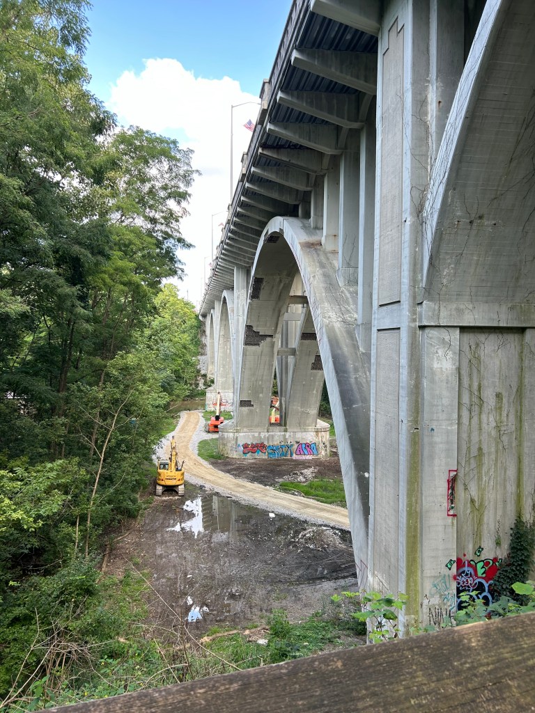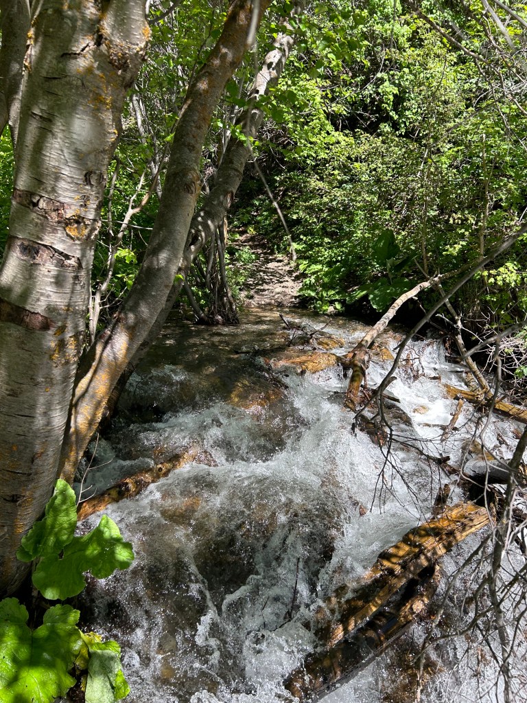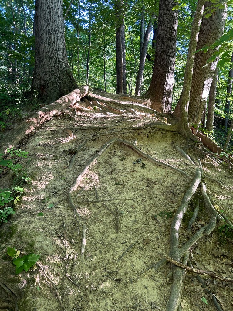 What I saw of the river was much browner than white, though there are likely rapids somewhere up or downstream. The river was high — there had been some serious thunderstorms in the Mideast in the days previous. There was evidence of tree falls on the trail that had been cleaned up, and heavy drainage down the side gullies.