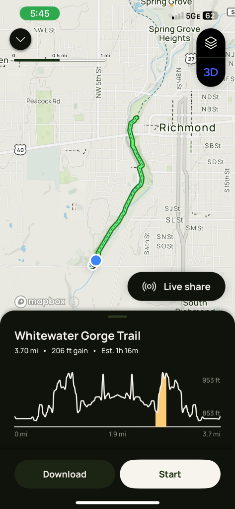I was not expecting much out of Richmond, IN, but I was pleasantly surprised by this scenic trail that follows the Whitewater River through the city. Heavily wooded and therefore heavily shaded, with some elevation variation, it was a refreshing way to cap a day of driving in hot and humid Indiana.