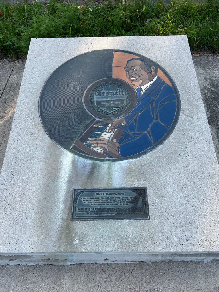 What was unexpected was what I found at the transition from trail to sidewalk — the site of Gennett Records, a studio that operated from 1920-1934 in the Starr Piano building. A line of memorial sculptures ran along the path, featuring Duke Ellington, Hoagy Carmichael, Jellyroll Morton, Big Bill Broonzy, Fats Waller, Lawrence Welk, Gene Autry, Charley Patton, Coleman Hawkins, Blind Lemon Jefferson, and many more.