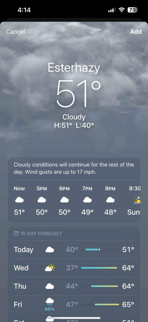 I will choose Esterhazy over Winnipeg any day. The heat in the hotel worked flawlessly, and the Papa Burger from the A & W that closed at 8 pm was divine.